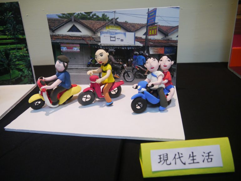 除了傳統文化外,Pindy也用捏麵人做出在印尼大街小巷都可見到的摩托車,象徵現代文化。(Asuka Lee拍攝)