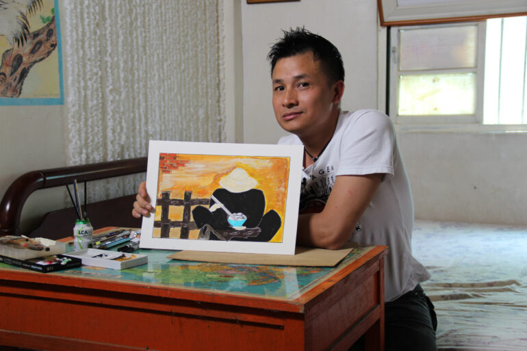 頗有繪畫天份的陳維興,時常用畫筆記錄下逃跑之後的心路歷程。這幅畫是講述他在剛逃跑的第一天,坐在路邊又餓又累時,遇到一位好心的阿嬤請他吃飯的回憶。
